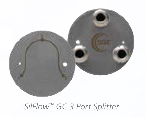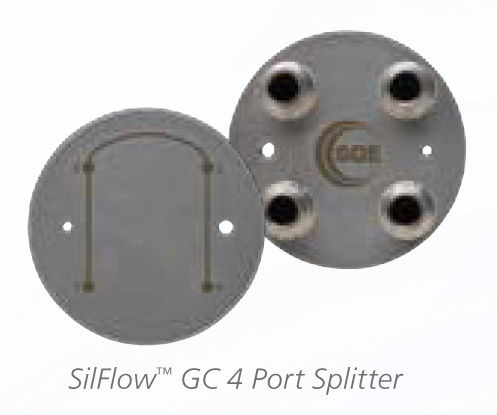 The SilFlow™ four port splitter has the added flexibility for incorporating additional gas flows (such as in back flushing) or adding additional detector capability. The four port splitter can function like a three port splitter simply by blocking off one of the ports.