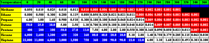 In the following chart, the Breakthrough Volume data is expressed in Liters per gram of resin. This is the volume of gas required to elute the organic compound off 1.0 gram of resin at the indicated temperature. The Blue highlighted areas indicate that the Breakthrough Volume is greater than 10 liters per gram of resin which is an acceptable value for the trapping of the organic compound at that temperature. The Red highlighted areas indicate that the Breakthrough Volume is less than 0.010 Liters per gram of resin or less than 10 ml/gram of resin. This is a good temperature to assure complete desorption of the organic compound off the adsorbent resin during the thermal desorption process.