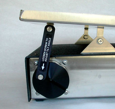 Loosen the screw on the back of the rocker an slide the linkage toward the center (to decrease the tilt) or perimeter (to increase the tilt) and then tighten screw.