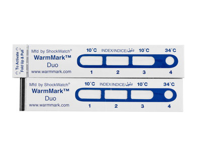 The WarmMark Duo Time/Temp Tag offers a two-in-one feature to allow monitoring exposure above two rated temperature thresholds. The indicator records exposure and duration to temperatures above 10°C (50°F) from 3 to 14 days while providing an extra window to record a brief temperature spike above 34°C (93°F).
