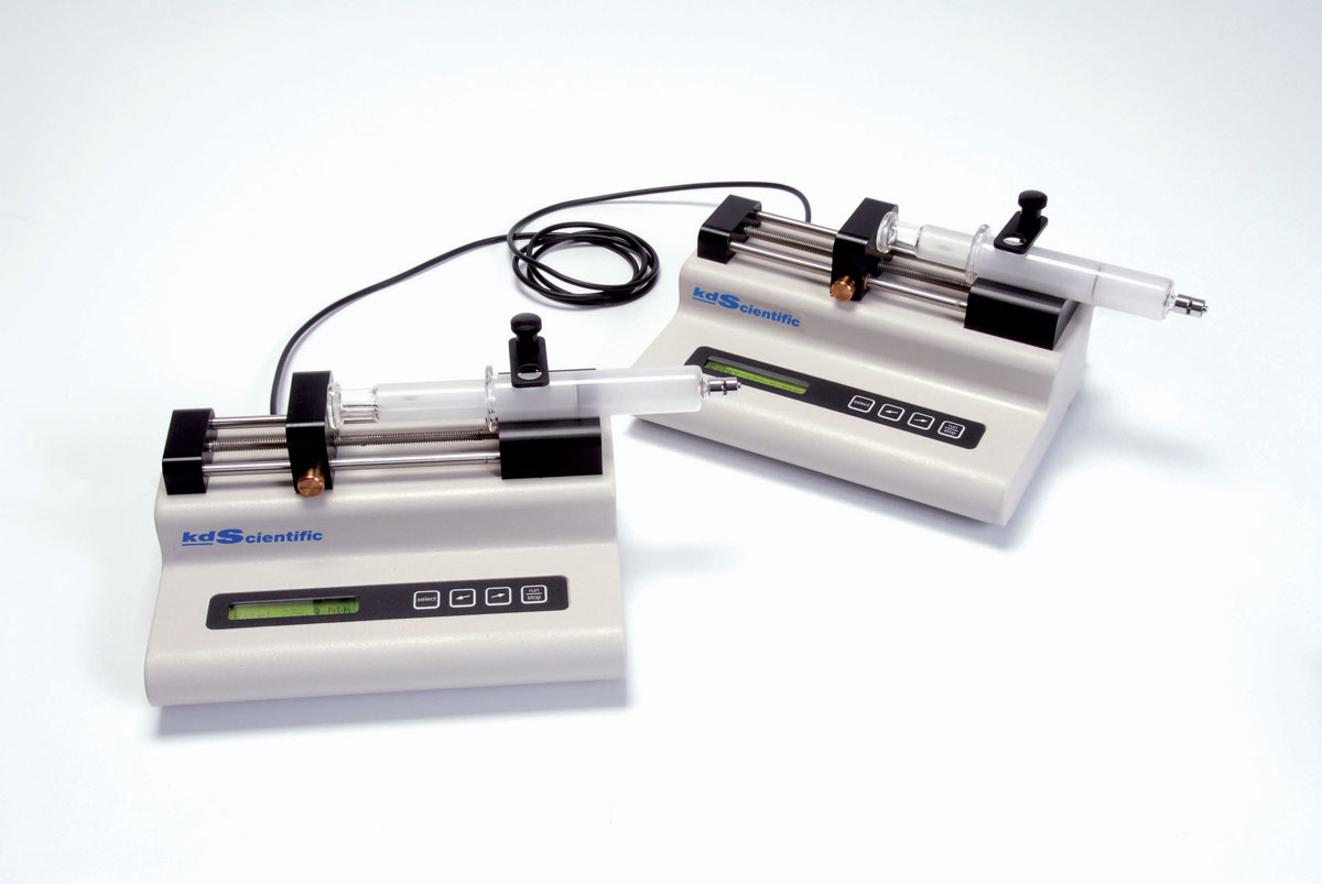 Activate two KDS 100 pumps simultaneously with one push of the start key. Set each pump with a different flow rate and the pumps will infuse at the same time. The system includes two KDS 100 pumps and the cable to link the pumps together. The two pumps can also be operated as standard independent KDS 100's.
