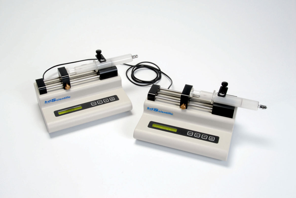 Sequential volume dispensing is easy with the new volume dispensing system. The system includes two KDS 100 pumps and the cable to link the pumps together. Set the same or different volume[s] in pump A and B; pump A will dispense the predetermined volume and start pump B automatically. Pump A and B can have unique flow rates. The two pumps can also be operated as standard independent KDS 100's.