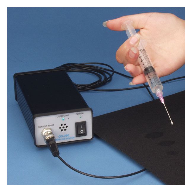 The OS-250 System is designed to detect spills around sensitive equipment and to take preventative action if able. The system includes special moisture-sensitive mats consisting of material specifically developed for detecting liquid spills. A simple electrical connection between the moisture-sensitive mat and KD Scientific's OS-250 Controller sets the alarm. When as little as three drops of water touches the mat an audible alarm is triggered and an LED starts flashing.