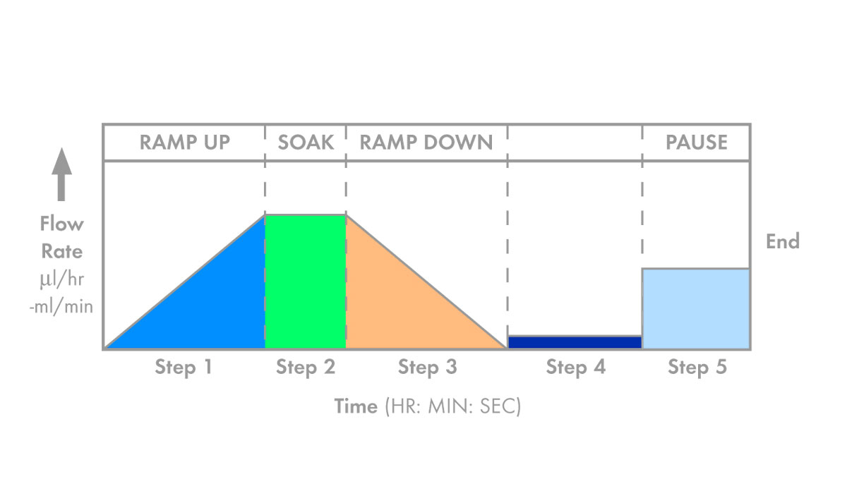 The flowrate can be ramped up or down or kept constant for a defined time period for a volume dispense. The initial and final flow rate for each period is entered and the pump automatically makes rate changes over the time period. No need to enter increments for a ramp up or down, the syringe pump automatically ramps the rate linearly.