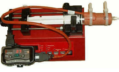 The pumps are often used in dual-pump setups, possibly with check valves for continuous pumping so that one syringe dispenses while the other reloads.