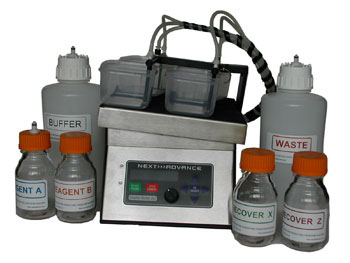 Pressing the "RECOVER REAGENT??? button on the front panel changes whether or not the reagent solution is collected after the reagent step. When the light by the button is on, the reagent will be recovered. If the light is off, when the reagent solution is aspirated, it will be sent to the waste container.