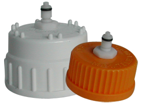 Pair of One>Click™ caps for 4L and larger Nalgene heavy duty bottles and carboys. Set of 2, one with silicone tubing for inside the Buffer Bottle.