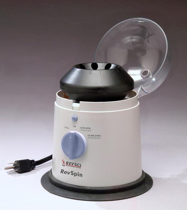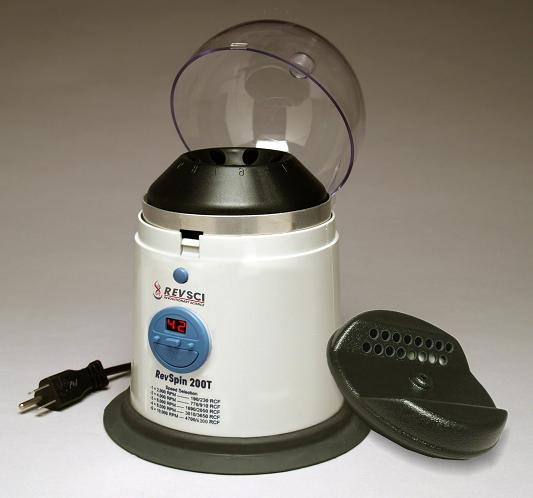 For pelleting your samples in 5 mL tubes, this personal size centrifuge has a rotor with a capacity of 4×5 mL tubes and 4×1.5/2.0 mL tubes, (8 tubes total) and runs at a fixed speed of 5,500 rpm / 2,000 x g.