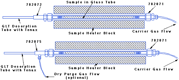 Samples to be analyzed are placed inside glass or stainless steel tubes and held in place by glass wool plugs. The system is designed to sample from 0.5" diameter glass tubes, and also from 0.25" diameter glass tubes with optional adaptors. Sample tubes are 14.0" long each. When ready for sample collecting, the long tube containing the sample is placed in the sample Collection Oven, fitted at one end with a supply of carrier gas to flush out the residues, and fitted at the opposite end with a preconditioned Desorption Tube with adsorbent resin. The Oven is set for the desired temperature and the desired components are collected onto the Desorption Tubes. Oven temperatures can range from room temperature up to 250º C. The temperature used, as well as the time of sampling, depends on the nature of the samples being analyzed and the requirements of the analyst. Soil samples are typically analyzed at 80º C and sampled for 30 to 60 minutes.