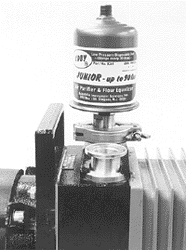 The Koby air purifier does not need to be placed directly on top of the vacuum pump. In many systems where space is limited, it is more convenient to attach a hose to the pump exhaust port and then using a KF-1, KF-2, or KF-3 fitting, adapt the Koby air purifier to fit the hose. It is also practical, using these same fittings, to run a hose or vacuum line from the top or exit nipple of the air purifier to exhaust any remaining contaminants to a hood or building exhaust system.