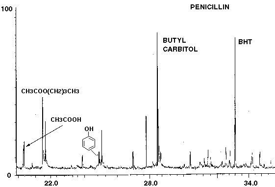 PENICILLIN. Ten (10.0) milligrams of an old (3 years) tablet of Penicillin was sparged at 125 degrees C into the GC injection port. A large number of compounds were detected which were possibly due to breakdown of the Penicillin with time or due to contamination of the original material. In addition, the solvent Butyl Carbitol (28.43 minutes) and the antioxidant BHT, Butylated Hydroxytoluene, (33.17 minutes) were also identified. This technique could not only be used to monitor impurities in pharmaceutical products during manufacture, but could also be utilized to detect and identify pharmaceutical decomposition with time.