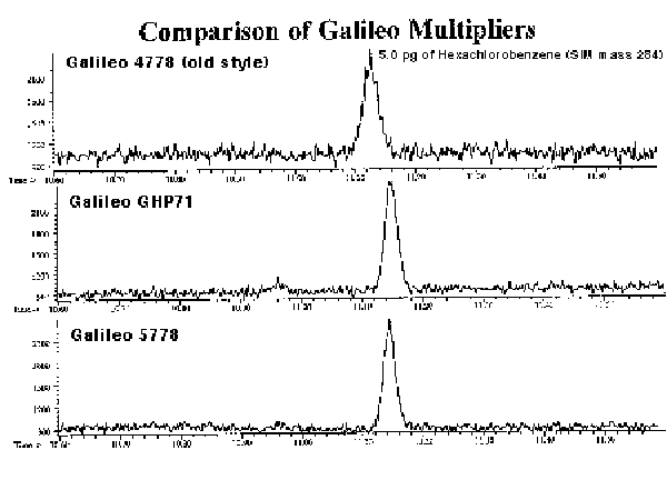 Other electron multiplier manufacturers have also been addressing the sensitivities of the electron multipliers. Figure # 3 demonstrates the comparison of the new Galileo Model 5778 with two other major manufacturers of multipliers for the HP 5971 MSD. The performance of all three manufacturers were near identical in sensitivity expressed as a signal-to-noise ratio. This data is the result of the examination of only one multiplier from each of the three different manufactures and therefore may not be 100% accurate. A more detailed study would have to investigate batch to batch variations of several multipliers and should investigate other factors such as the dynamic range and multiplier lifetime. We are not prepared to do this at this time.