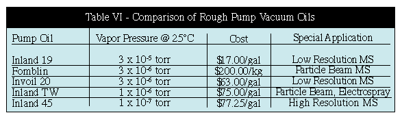Several new rough pump oils have been introduced in the last few years for use with rough pumps on mass spectrometers (Table VI). Seven or eight years ago, we were recommending Inland 19 as the best oil for rough pumps on mass spectrometers. This oil was equivalent to the standard oils used by Alcatel, Edwards, Welsh, Varian and Precision on their rough pumps. Inland 19 oil is still used by most pump manufacturers as the standard pump oil for their pumps. It is relatively cheap and is sufficient for most applications.